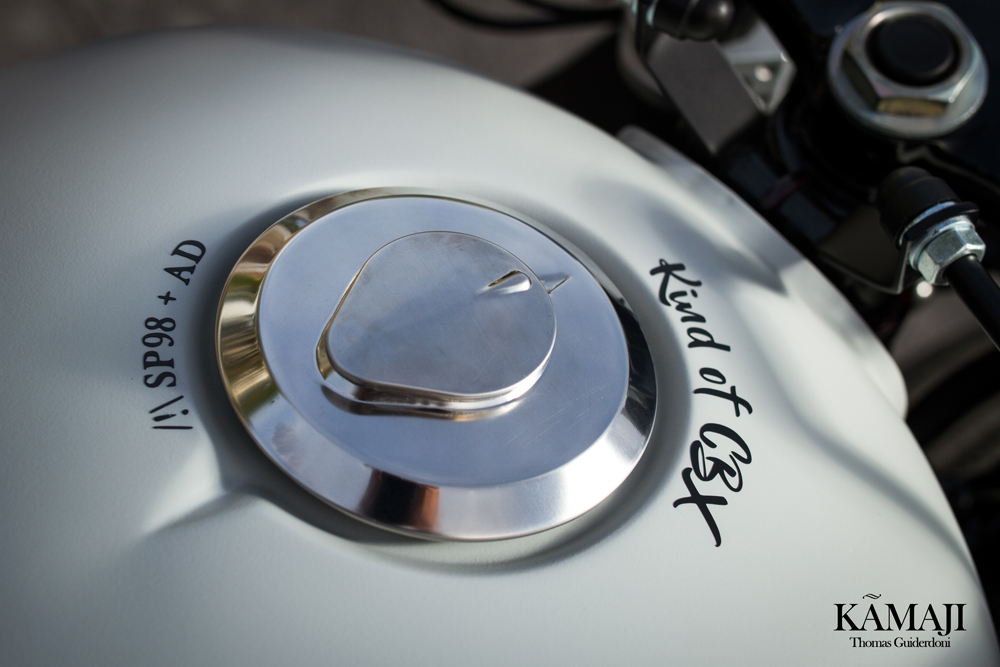 Ici, l'optique rectangulaire d'origine cède sa place à une tête de fourche signée Radical Ducati sur laquelle il a été décidé de ne pas mettre de bulle à l'instar de certaines créations japonaises. Le réservoir est issu d'une CB 650 de la même époque. Quant à la coque monoplace il s'agit d'une selle "Le Mans", la même qui équipait nos mobs il y a vingt ans.